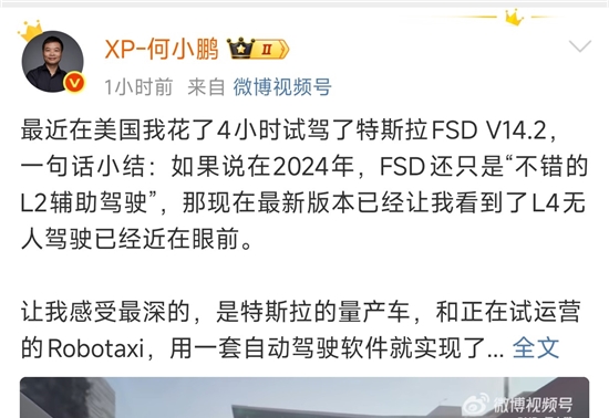 - 简介:在试驾完特斯拉FSD V14.2版本后,小鹏汽车董事长何小鹏直言:“2026年全自动驾驶会真正到来”。12月30日,何小鹏在其微博账号发布长文,分享了近日在美国历时4小时深度体验特斯拉FSD V14.2版本后的震撼感受。图片来源:何小...[详细]