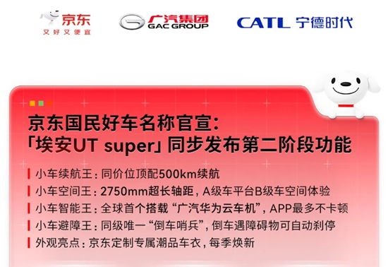 - 简介:10月23日,京东联合广汽集团、宁德时代推出的“国民好车”车型名称正式官宣定名——“埃安UT super”,并同步释放新车4大核心功能点。图源:京东续航方面,埃安UT super基于宁德时代巧克力换电技术优势,在同级车首次配备500K...[详细]