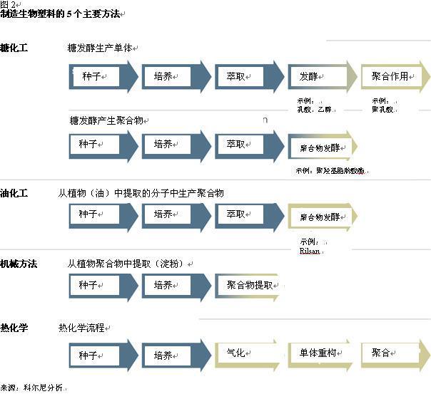 为了应对最后一项的挑战——循环利用性——化工产品公司必须制定新的方法,比如采用生物来源的和可循环的材料以减少塑料对环境的影响。生物塑料生产采用可更新原材料,主要是两种农业资源——淀粉基的(主要来自甘蔗)、以及玉米、土豆、甜菜和油聚合物(见图2)。这样会使生物塑料的基础原材料多样化,对石油的依赖性降低。