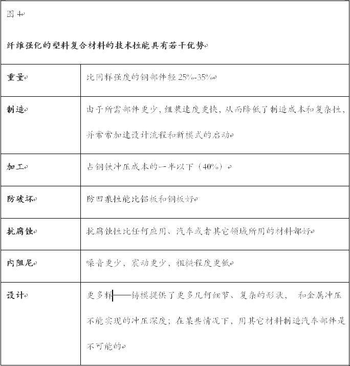 为了解决这一两难处境问题,有3个备选解决方法:使用结合了钢铁和塑料的优点的复合材料。这些强化纤维的塑料在材料特性和成本竞争力上都是钢材的可靠替代品(见图4)。强化纤维塑料目前被用来制造结构性零部件和非结构性零部件比如座椅结构、保险杠、发动机罩和燃料箱。