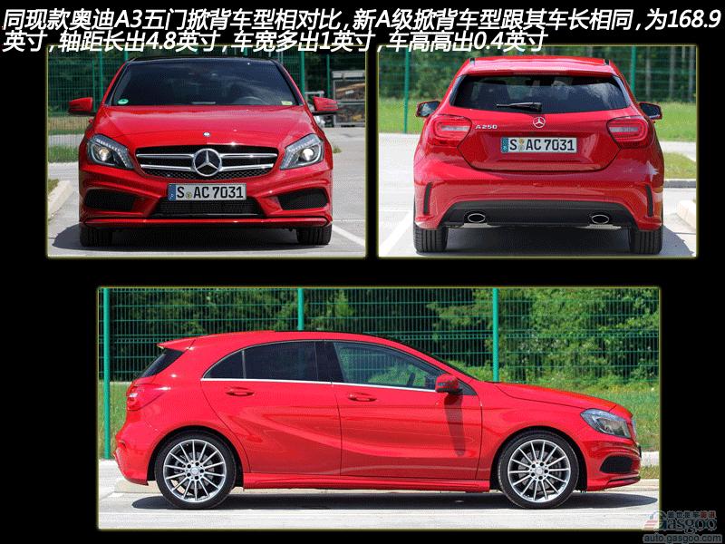 同现款奥迪A3五门掀背车型相对比,新A级掀背车型跟其车长相同,为168.9英寸,轴距长出4.8英寸,车宽多出1英寸,车高高出0.4英寸;奥迪A3的载货空间为19.5~39.0立方英尺,而奔驰A级的载货空间为12.1~40.1立方英尺(载货空间的改变是由于放平后排座椅导致行李箱空间的增大)。