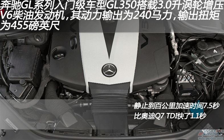 奔驰GL系列入门级车型GL350搭载3.0升涡轮增压V6柴油发动机,其动力输出为240马力,输出扭矩为455磅英尺。其百公里加速时间仅为7.5秒,这与同样搭载3.0升涡轮增压柴油发动机的奥迪Q7 TDI相比整整快1.1秒。在四分之一英里加速赛中,奔驰GL350用时15.7秒,最高时速可达到85.5英里/小时。而奥迪Q7用时16.5秒,最高时速可达到82.3英里/小时。此奔驰GL350柴油机车型可保证线性动力输出因此其驾驶流畅,对于柴油机车型来说,噪声、振动和舒适性(NVH)特性并非关键,而关键的是车内环境要安静。在试驾奔驰GL350时并没有时速慢的感觉,但是在试驾奔驰GL系列其他两款车型时真心感觉到了奔驰GL350的速度劣势所在。