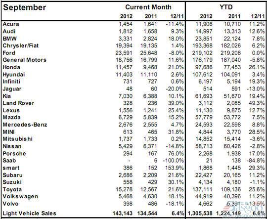 2012年9月加拿大轻型车销量(分品牌)