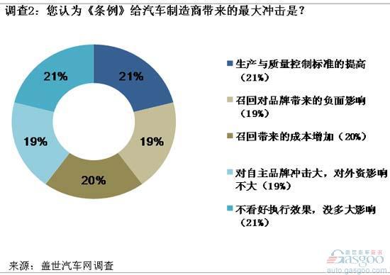 召回《条例》的出台对汽车制造商而言具有更多的积极意义。在关于这一法规给汽车厂商带来何种影响的调查2中,"生产与质量控制标准的提高"获得了最多的投票,约占总投票数21%;但同时,也有多达21%的人士不看好此部法规的执行效果,认为这对汽车制造商的影响并不大。