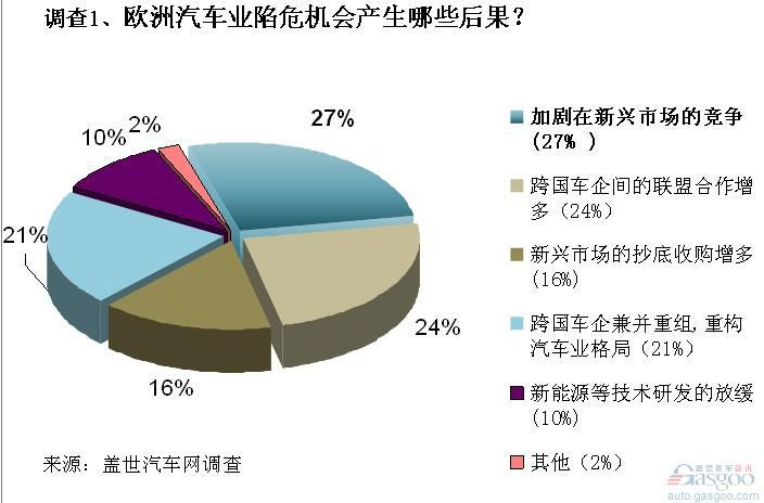 另外,有16%的参与者认为此次欧洲汽车业危机已经为新兴市场资本抄底欧洲优势汽车资源打开了大门,新兴市场针对欧洲汽车业的抄底收购将增多。而9%的参与者则认为由于此次危机,大部分欧洲车企盈利水平大幅下降,而需要大批资金支撑的新能源等新技术研发将因此放缓。剩余2%的参与者则选择了还会出现其他后果。@@page@@