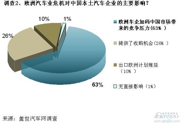 在我们的调查2中,针对此次欧洲汽车业危机对中国本土汽车企业的主要影响进行了设问,其中,有多达63%的参与者认为欧洲汽车危机对中国车企最大的影响在于将加剧中国市场的竞争压力。与短时的天灾影响不同,经济的复苏往往需要一个以“年”为计算单位的周期,有经济学家认为,危机国家的经济恢复是一个长期的过程,至少需要5年的时间。对于跨国汽车制造商而言,面对欧洲经济复苏前景难明的境况,他们不得不进行更为积极的调整,想尽办法向包括中国在内的新兴市场转嫁危机,尽早恢复盈利。
