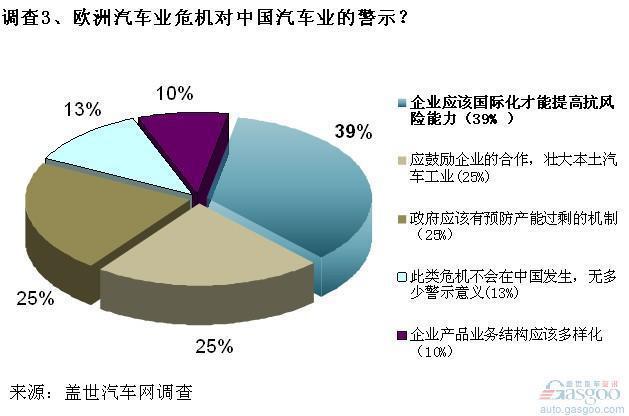 另外,有26%的参与者认为此次欧洲汽车业危机为中国车企提供了绝佳的收购抄底时机,而近日传来的东风汽车收购瑞典工程公司70%的股权的消息似乎也在印证着这一判断。但我们的线下采访中,多数业内专家对此仍持以谨慎的态度,专家指出,除抄底整车企业外应更加注重具有核心技术的关键零部件企业,在寻求完全的并购之外,应该务实的通过参股、合作开发、技术转让等更有保障的方式多管齐下,以降低投资风险。@@page@@