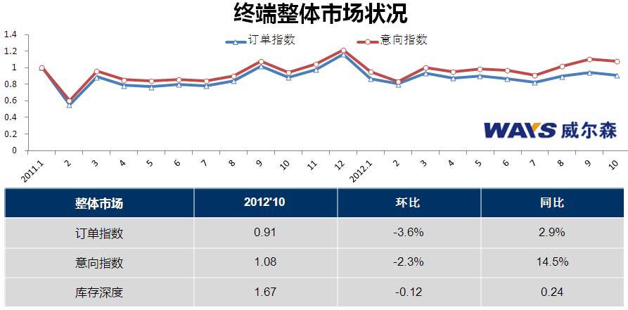 乘用车整体终端市场10月意向环比下降2.3%,同比上升14.5%;订单环比下降3.6%,同比增长2.9%。从数据表面上分析,全国九大城市举办车展有效地增提终端客流,具体为长沙、杭州、广州、南京、深圳、沈阳、石家庄、武汉、西安。但十一超级黄金周,消费者忙于出行,10月有效销售工作日仅有18天,所以整月销量有所削减。