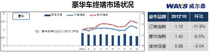豪华品牌库存持续走低,10月库存量为0.88个月,紧贴安全下限(行业惯例库存合理水平为0.8-1.2个月),表示库存逐现紧张。厂商10月实施应对措施,减少让利。促销优惠的大幅减少导致终端市场订单下降8.5%。"豪华品牌销量在9月上冲,现在只是回归正常水平。10月价格回调提高单车销售利润,经销商售车风险得以缓解。"威尔森营销信息研究陈延伟总监表示。