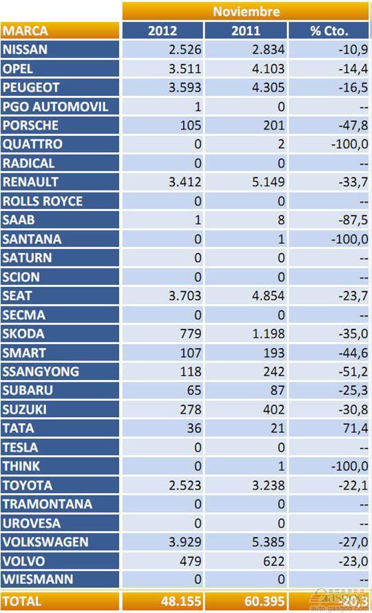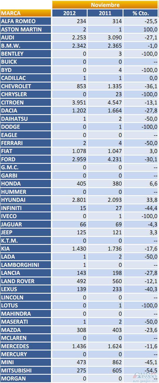 2012年11月西班牙乘用车注册量(分品牌)