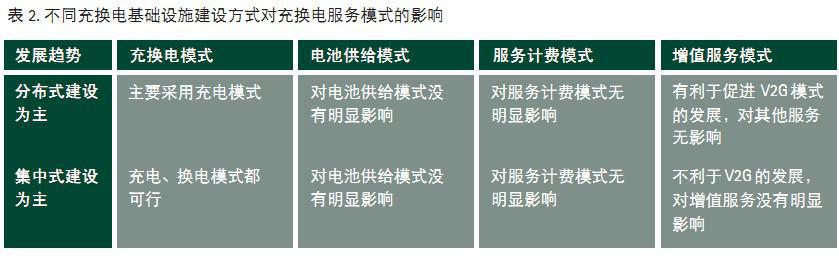 为了详细说明充换电基础设施的不同建设方式对电动汽车充换电服务模式的影响,埃森哲列举了不同充电换基础设施建设方式下,充换电服务模式各主要组成部分受到的影响(见表2):