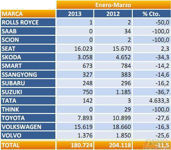 2013年1-3月西班牙乘用车注册量(分品牌)