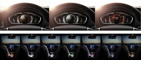 V40采用了许多个性化的功能配置。比如TFT液晶数字仪表盘,在车辆启动时会显示简洁的V40轮廓线条,同时可以提供三个主题背景——优雅、环保、炫动,显示不同的功能和布局,打造科技现代的驾驶感受。 V40在内饰氛围上也下足功夫,除了三种主题仪表外还提供7种不同的车内极光氛围灯,色彩随心而变,车主还可以选择根据车内温度让车辆自动调节灯光色彩,打造个性的夜间车内氛围。