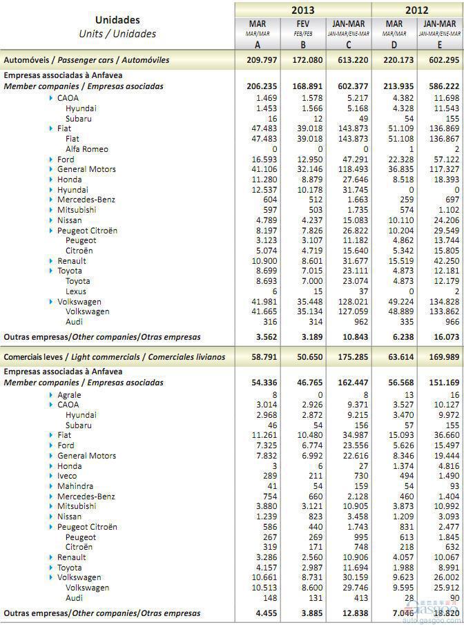 2013年3月巴西轻型车销量统计(分车企)