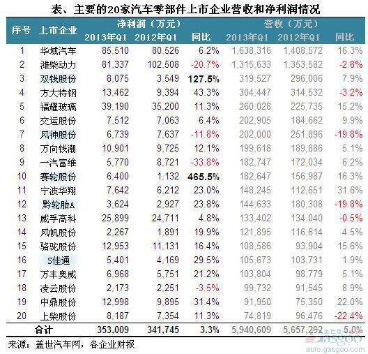 2013年一季度我国汽车零部件上市企业净利润简析