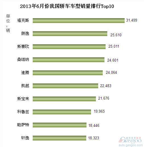 2013年6月我国轿车车型销量排行Top10