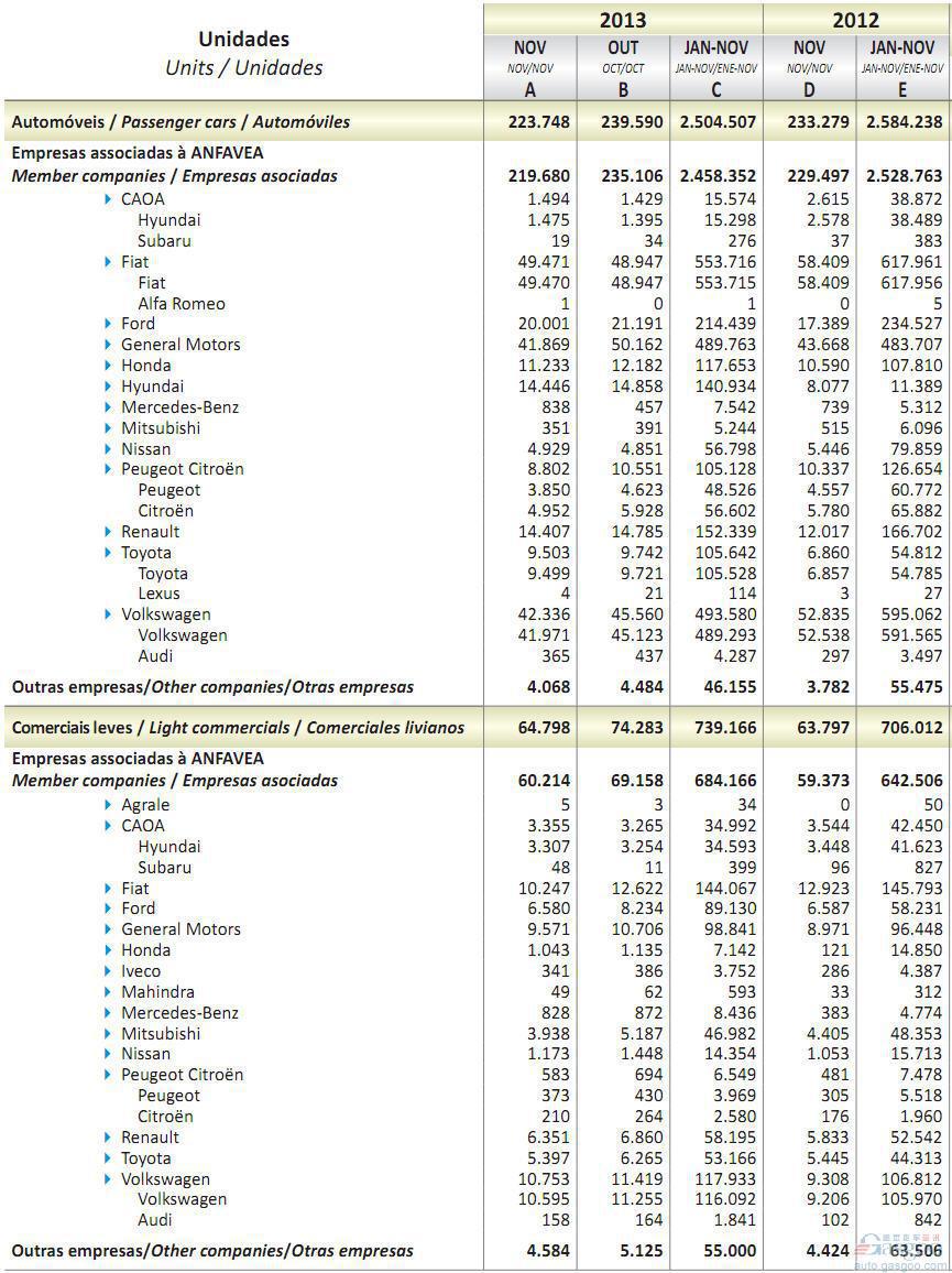 2013年11月巴西轻型车销量统计(分车企)