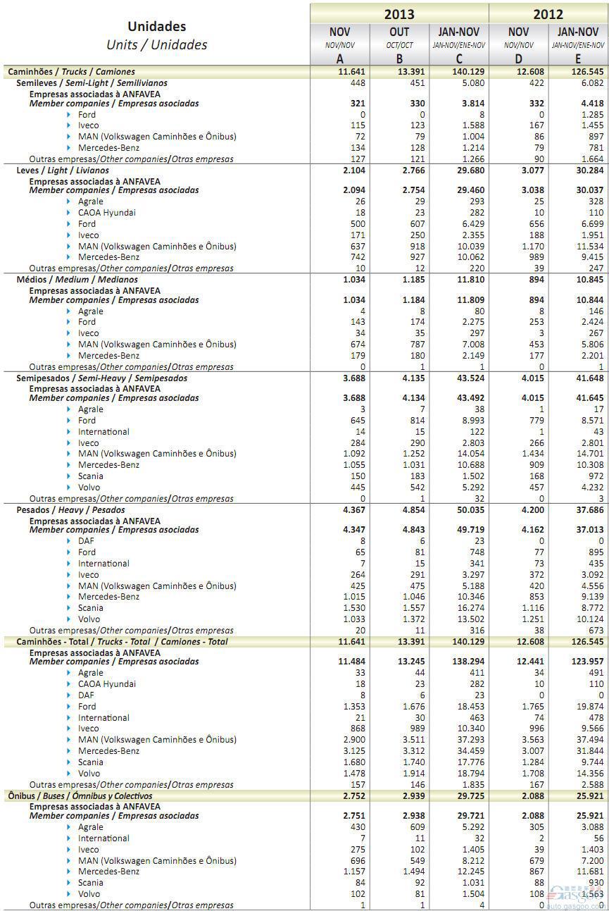 2013年11月巴西商用车销量统计(分车企)
