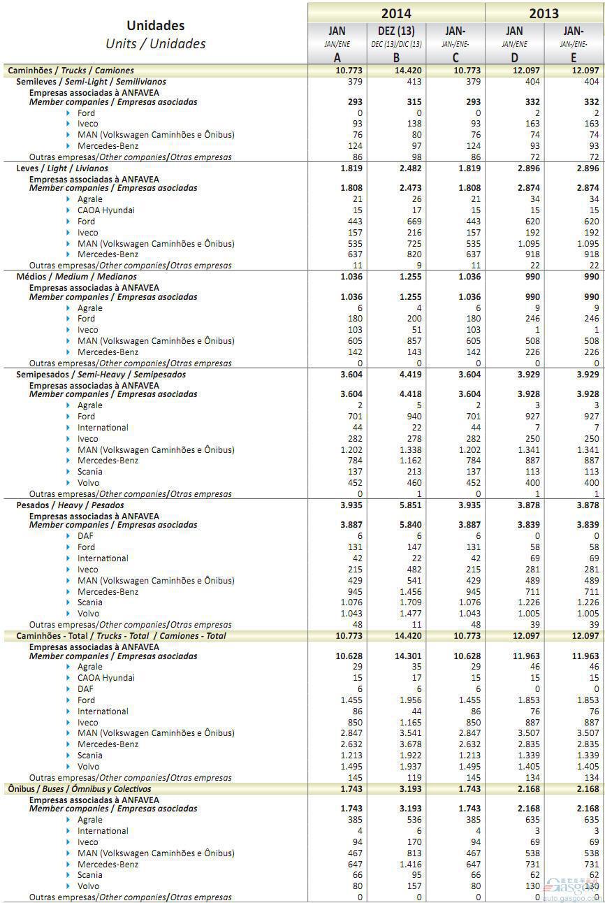 2014年1月巴西商用车销量统计(分车企)