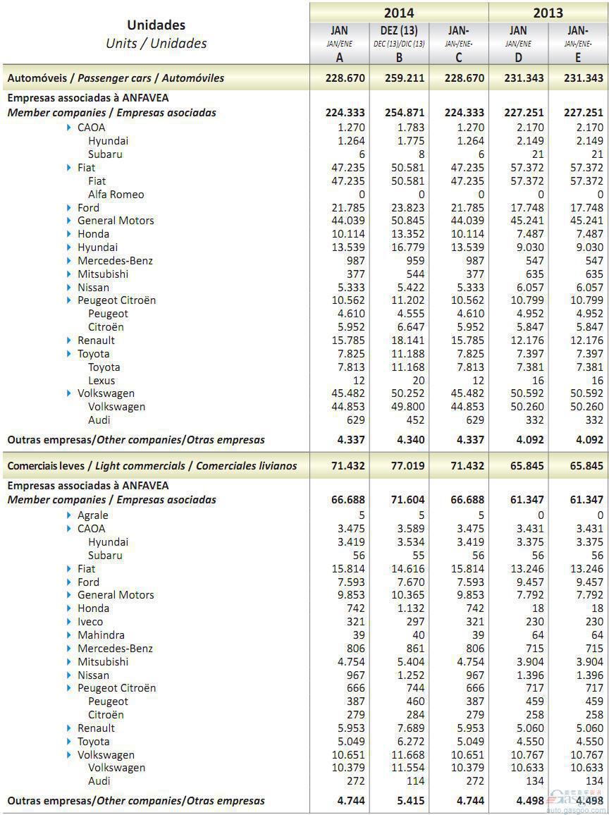 2014年1月巴西轻型车销量统计(分车企)
