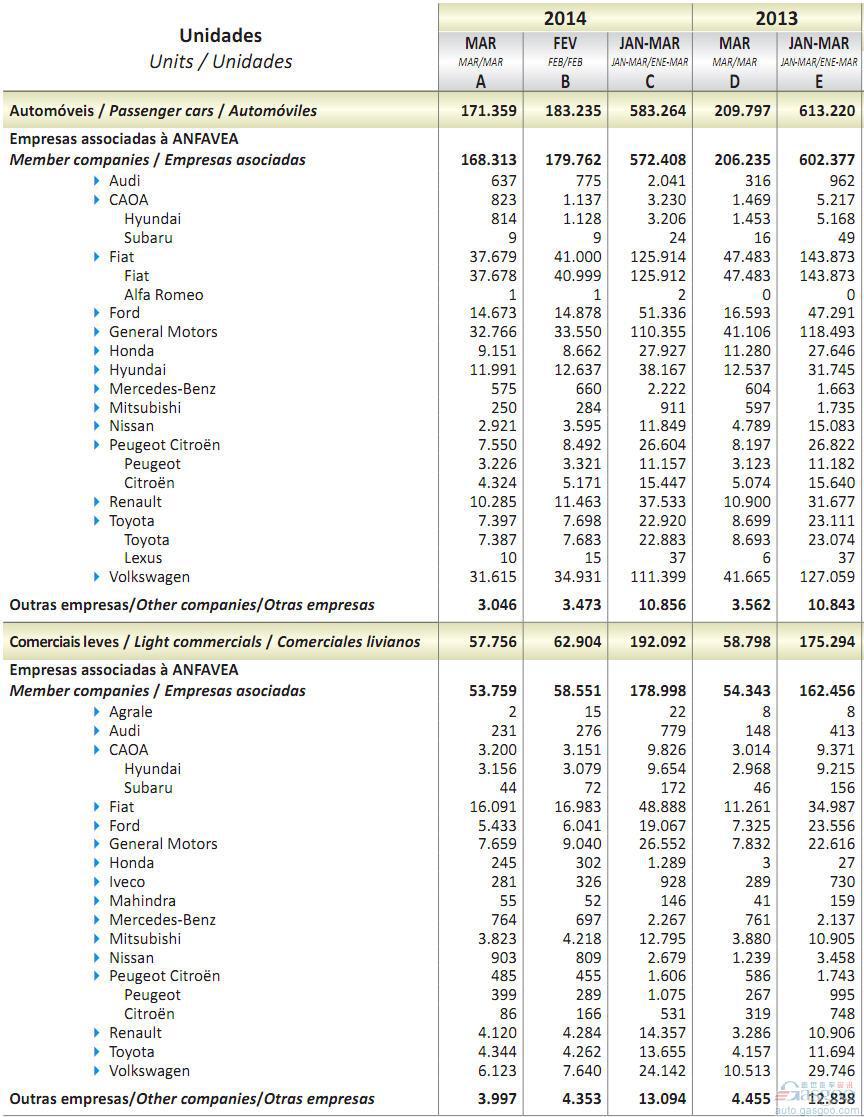 2014年一季度巴西轻型车销量统计(分车企)