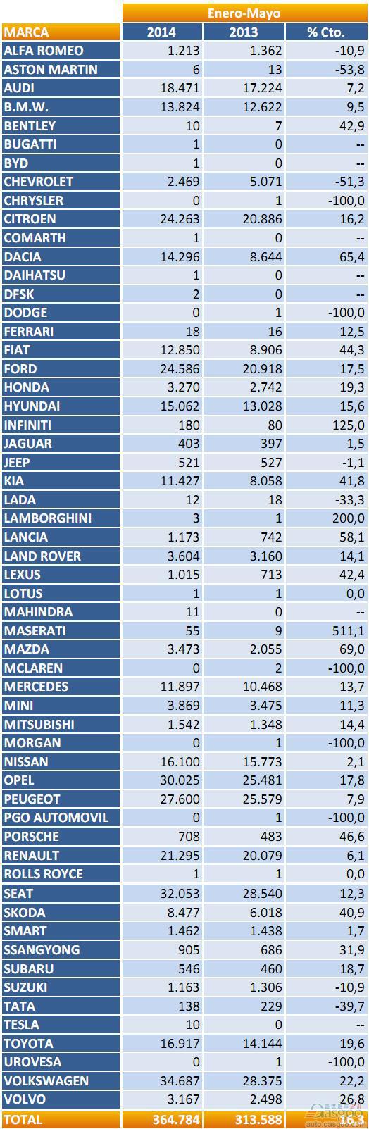 首页 > 资讯 > 2014年1-5月西班牙乘用车注册量(分品牌)