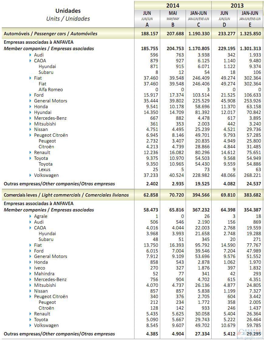 2014年上半年巴西轻型车销量统计(分车企)