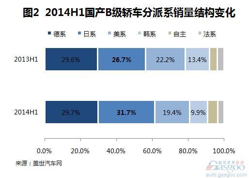 美系品牌B级轿车上半年销量实现21.34万辆,同比也有23.1%的增长,新车新蒙迪欧带动了其销量整体增长,其市场份额同比上升2.8个百分点至22.2%。法系车销量增长13.5%至3.60万辆。德系品牌销量增长7.2%至28.51万辆,市场份额近三成,为29.6%。