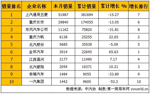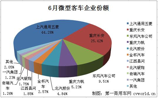 2014年6月份,国内微型客车市场销售117393辆,销量排名前十的企业共计销售114983辆,占据整个微型客车销量份额的97.95%。排名第一的上汽通用五菱以44.28%的市场份额继续“称霸”。排名如下: