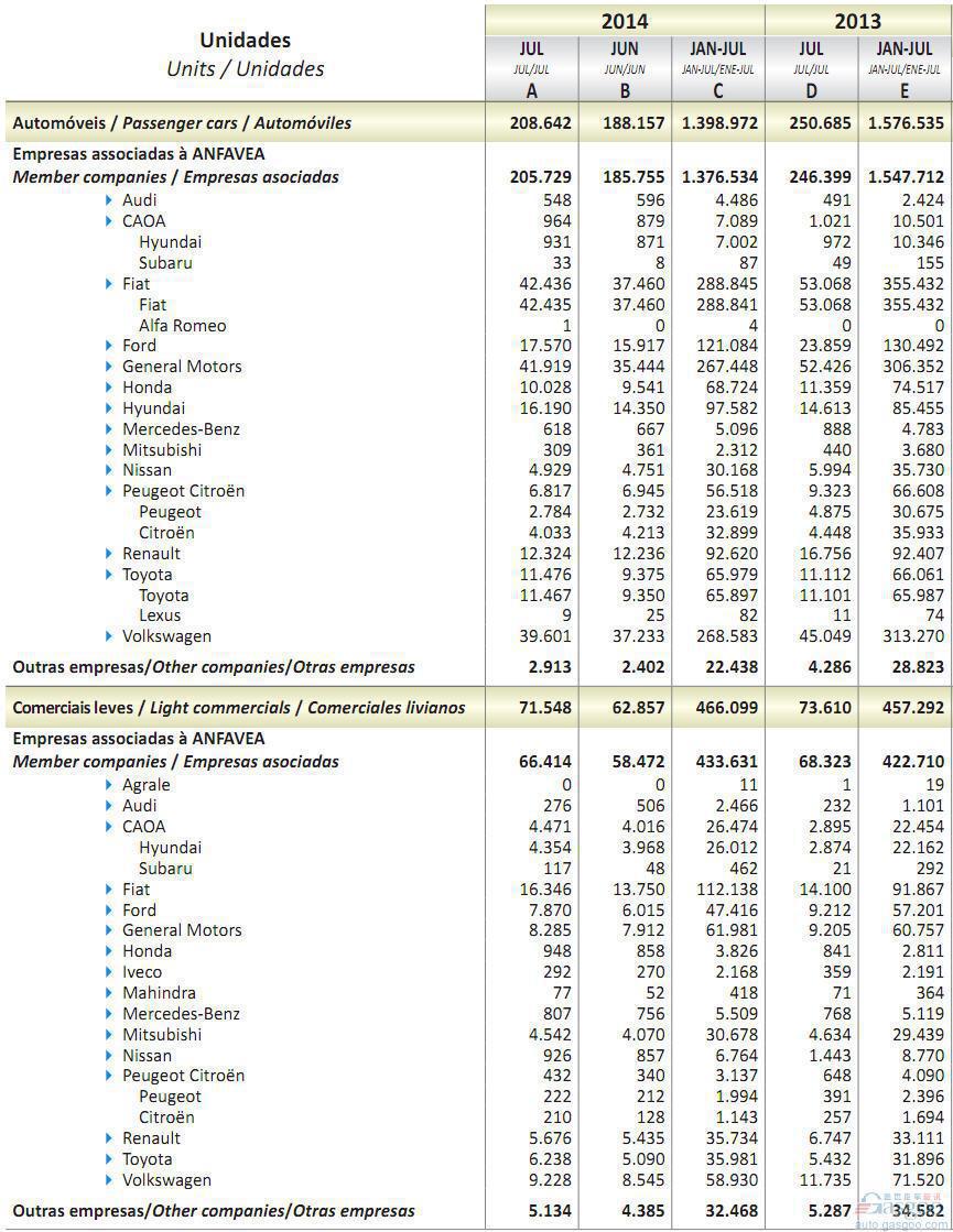 2014年7月巴西轻型车销量统计(分车企)