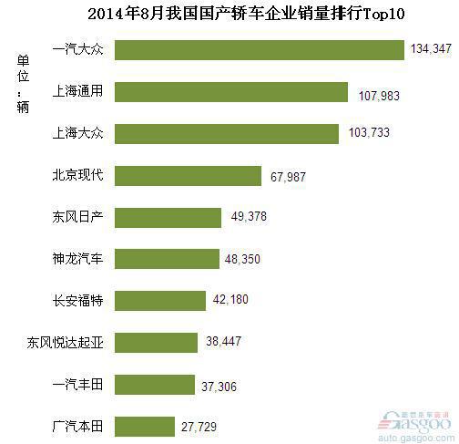 2014年8月我国国产轿车企业销量排行Top10