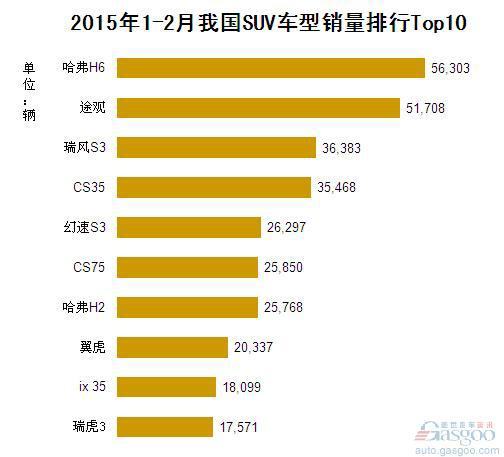 2015年1-2月我国SUV车型销量排行Top10