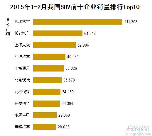 2015年1-2月我国SUV企业销量排行Top10