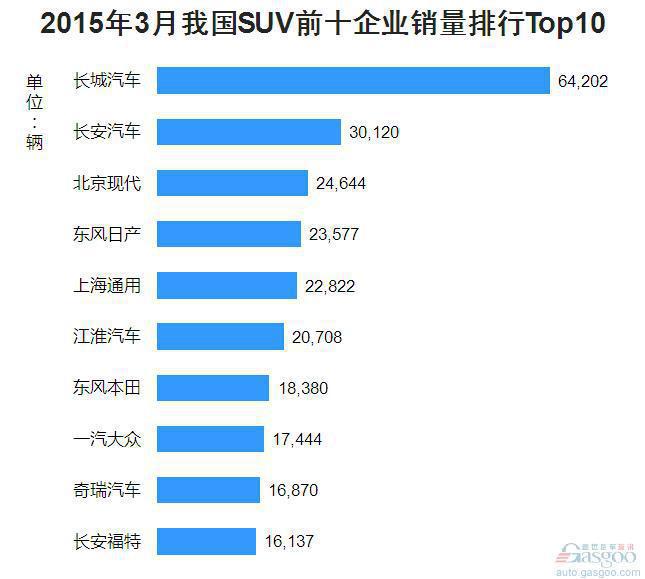 2015年3月我国SUV前十企业销量排行Top10