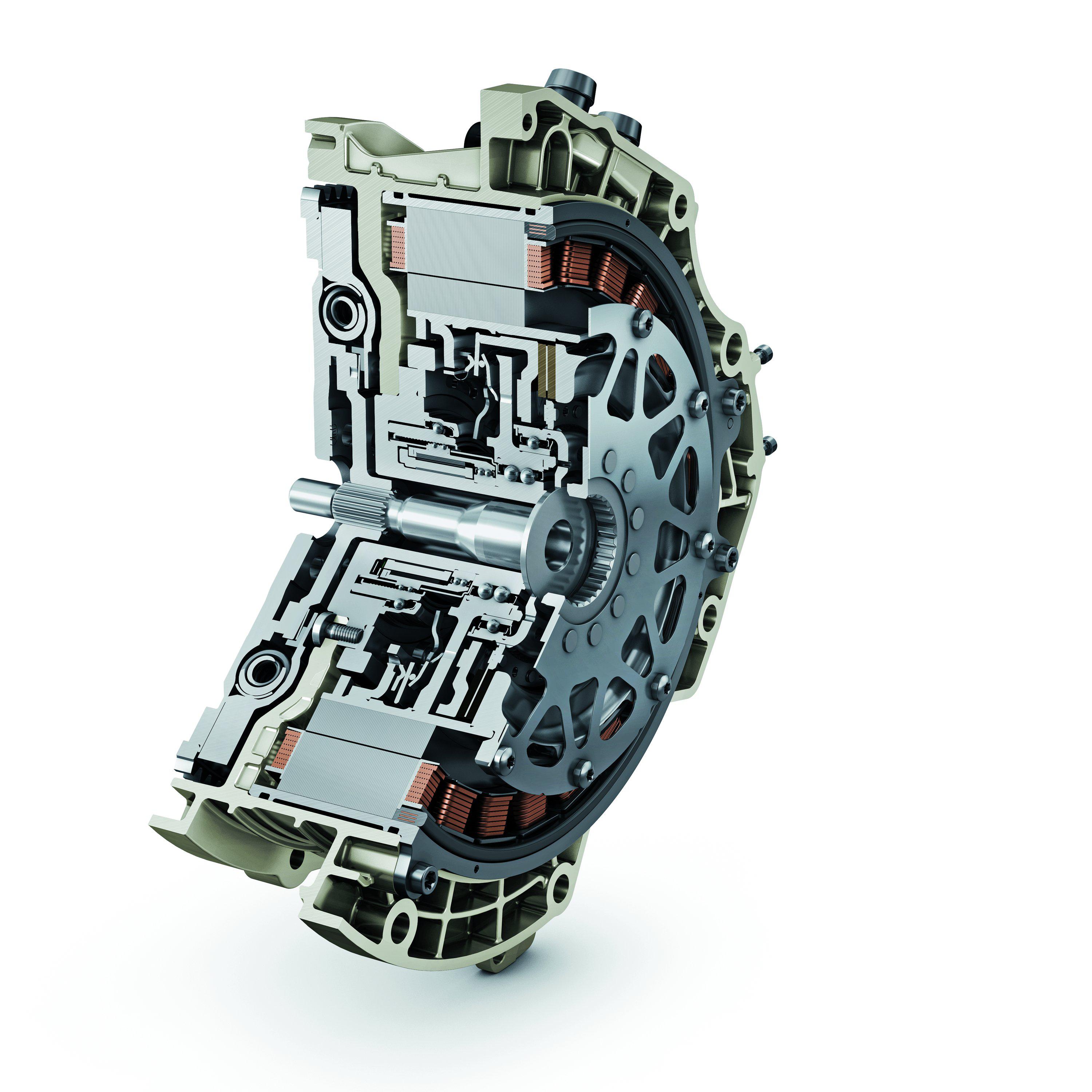 该动力模块包含了高功率密度的永磁同步电机、P2干式离合器和电动中心式执行机构。整个系统可集成25kw至80kw的电机,通过P2离合器传递高达250Nm的扭矩(在结合单向离合器后可提高至800Nm),并在起动发动机时精确控制发动机和电机之间的扭矩传递。