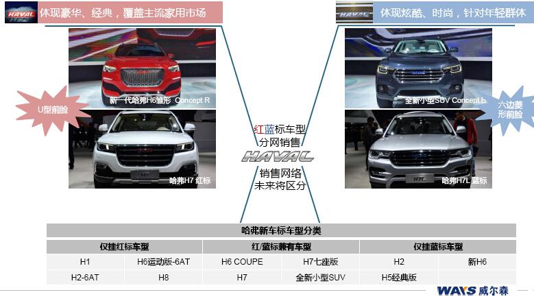 哈弗在上海车展发布红蓝标战略,形成以红色和蓝色LOGO为代表的双产品线,销售网络也将分为红标和蓝标网络。哈弗计划通过该战略将市场需求进一步细分,在提升品牌的同时最大的扩张市场份额。