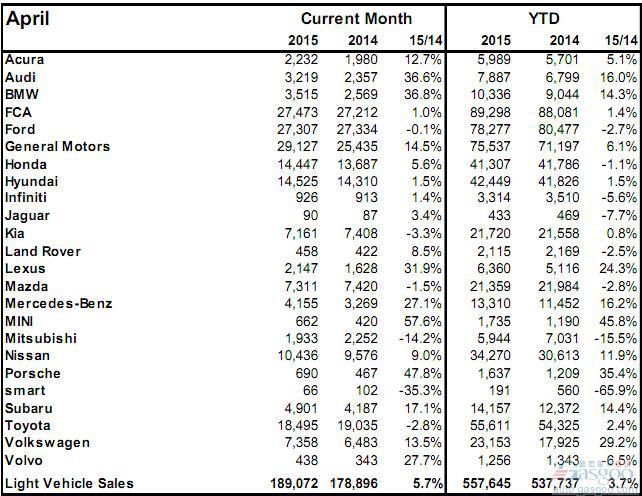 2015年4月加拿大轻型车销量(分品牌)