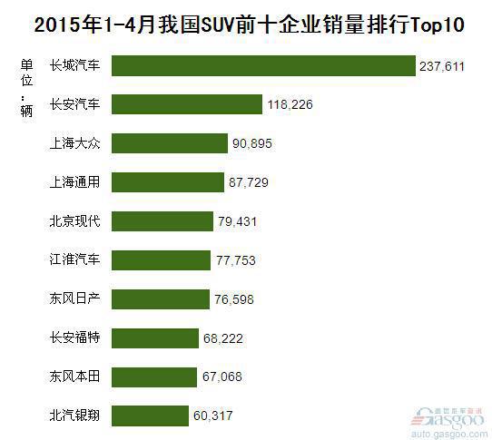 2015年1-4月我国SUV前十企业销量排行Top10