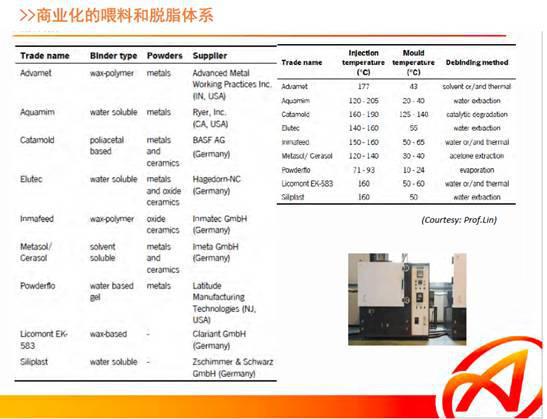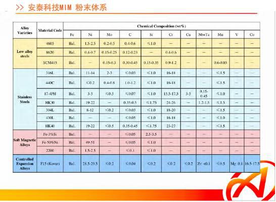 主要原料是金属粉,粉末粒度大约在10-20微米。目前各种材料粉末可以通过图示多种方法得到,可以是元素粉,也可以是金属粉。国内提供MIM粉末的公司有安泰科技,龙鼎粉末,天一粉末,岳龙粉末等公司,这是安泰科技商品化多种牌号的MIM粉,粘结剂是由几种聚合物或石蜡、助剂等组成,在一定温度下具有流动性。金属粉和粘结剂在加热的混合机内混合均匀,冷却后造粒,即成为成型的注射料。