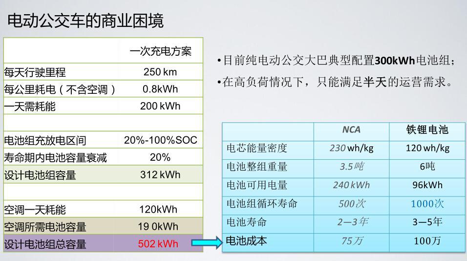 实际上在现在锂电池能量密度水平上,如果装配磷酸铁锂,大概500千瓦时的电池可能要6吨重, 目前的成本至少要100万以上,这样一个电池在12米在体积和重量上都装不了, 所以这个方案大家都用不了。