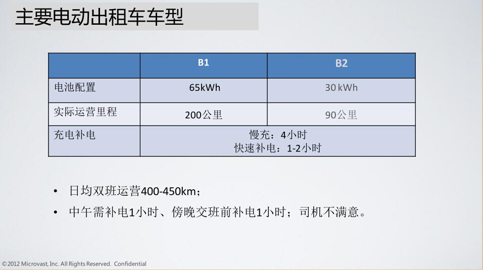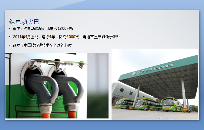 那为什么要特别强调快充这个特征,我想先从电动车的应用端来说起。第一个在我们国家推广这个新能源车的时候,政府最容易推动的市场是电动公交车,纯公交车从奥运会开始到世博会到现在大概有六七年时间了吧,在很多城市都有应用。看一组简单的数据,这个PPT就讲到了电动公交车在商业应用中遇到的困境。