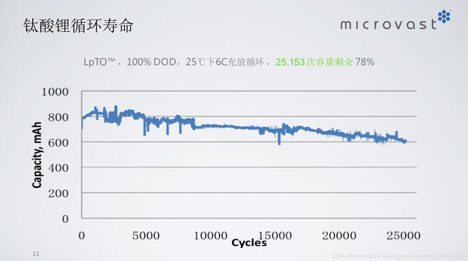 那么针对这两种需求,有没有电池能够满足这种商业上的要求?我们刚才谈到了十分钟或者十五分钟充电,那么它的寿命希望达到五千次,甚至是一万多次。从2007年开始微宏一直在这方面在做努力,在过去的几年中,我们先后开发了两代的产品,第一代是钛酸锂,这个电池在25℃下6C充放循环下,循环两万五千次容量可剩余78%,第二张图是第二代我们称为多元复合锂电池,这个电池有一万次的循环寿命。