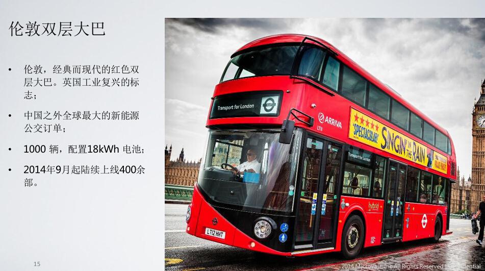 同样是在去年,伦敦这个红色双层巴士,1000台的订单下给了微宏动力,这个系统是一个增程式的串联系统,配了18个千瓦时的钛酸锂。目前已经有400多台上线运行了,在今年年底之前会把剩余的500多台投入运行。