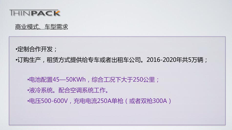 从现在新能源汽车政府推广的力度来看,公交车的力度是最大的,紧随其后,政府的手能够伸到地方就是出租车。所以我们总结一下运营车辆的特征,不管是出租车还是公交车,第一个它是一个生产工具,它有别于我们个人消费者的车辆,每天的运行要十五小时甚至到二十四小时,车辆每天的运营里程很长,公交要二百五十公里,出租车要五百公里以上,第三个是车辆的寿命,或者说对电池的寿命要求都希望达到六十万甚至一百万公里,所以简单来说,针对这样的需求,快速充电和长寿命是这个电池最基本的一个特征。
