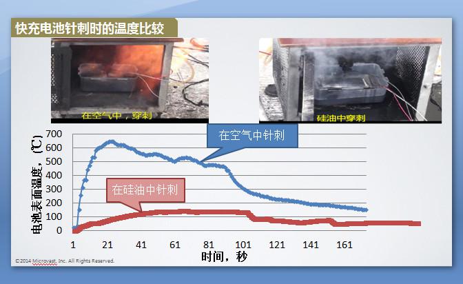 我们做了一个具有象征意义的测试,在空气中尖穿刺一个铝壳电池或者在油中间穿刺一个电池,测试发现,在空气中穿刺的时候,我们观察到电池表面的温度是六百多度的高温,并且很容易起火,而在油中针刺的时候我们能观察到的温度大概只有一百多度。所以隔绝空气能够很有效地缓解电池在出现失控的时候的危险。