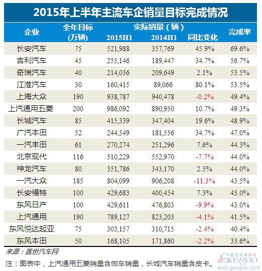 2015上半年车企销量目标完成率排行榜:长安已满70%