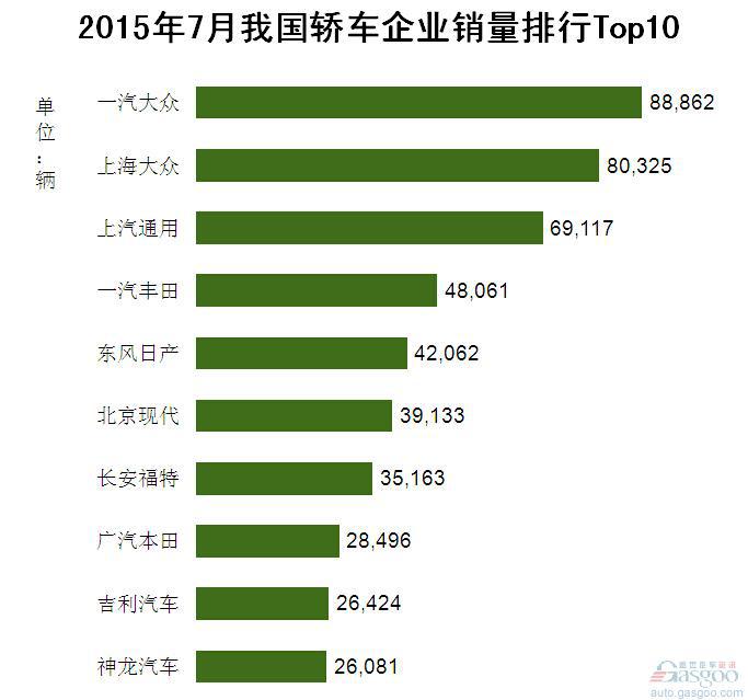 2015年7月我国轿车企业销量排行Top10
