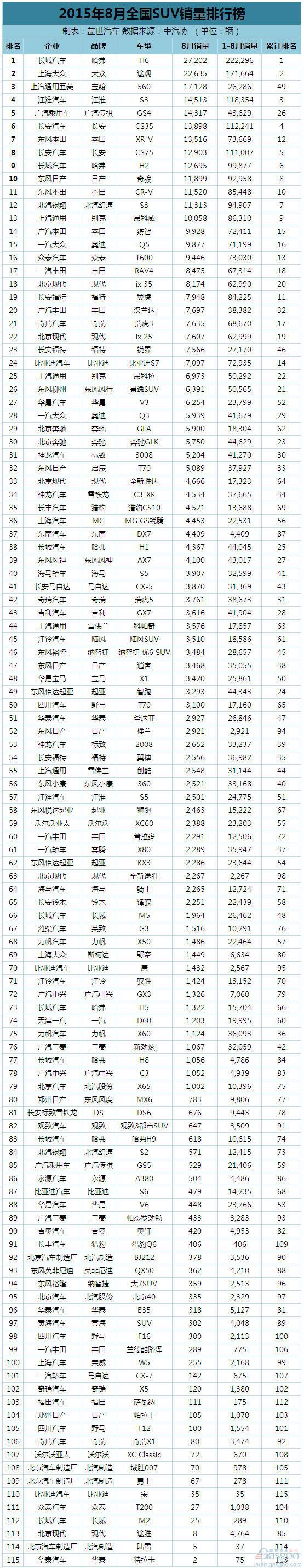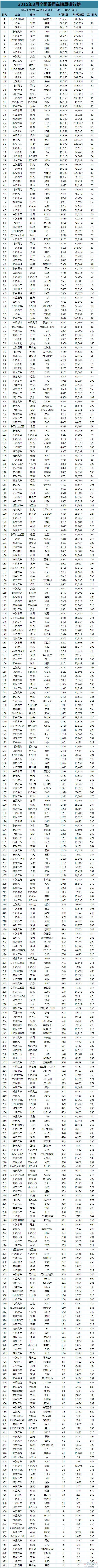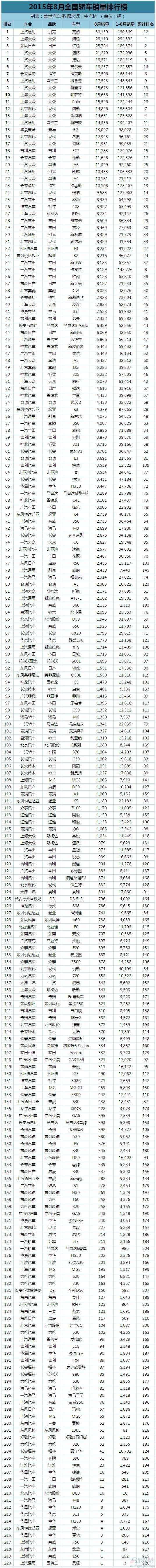 盖世汽车研究院根据中汽协数据整理出2015年8月份中国乘用车销量排名,总计373款车型,涵盖轿车、SUV和MPV三类狭义乘用车排名和所有车型的总排名。整体来看,8月车市依旧表现不佳,呈现下行走势,其中自主品牌表现较好:总排行榜中有三款车型入围前十,SUV前十强中更是占据七席。7月份表现坚挺的日系车上月表现不佳。