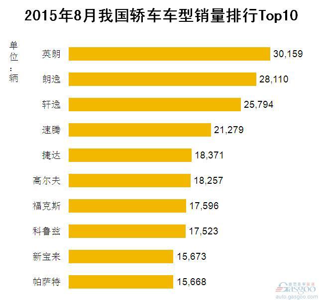 2015年8月我国轿车车型销量排行Top10