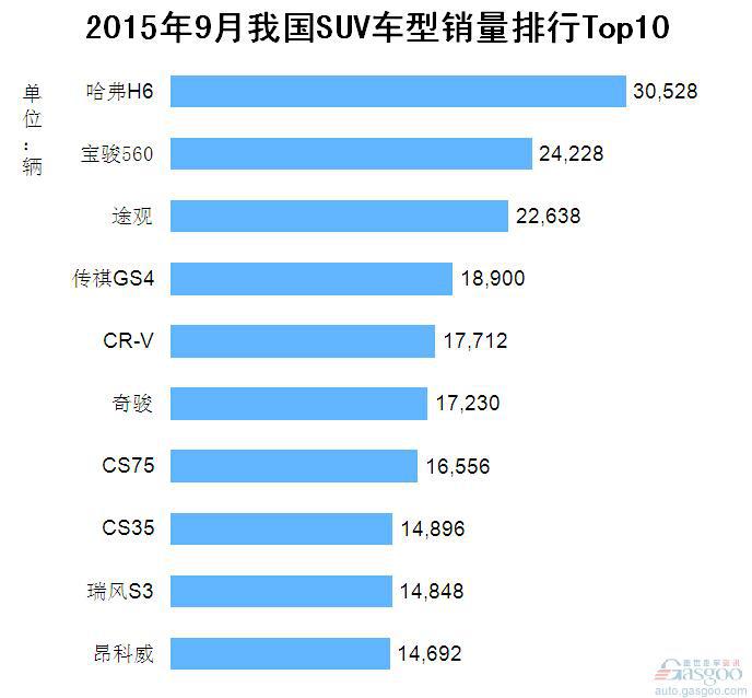 2015年9月我国SUV车型销量排行Top10